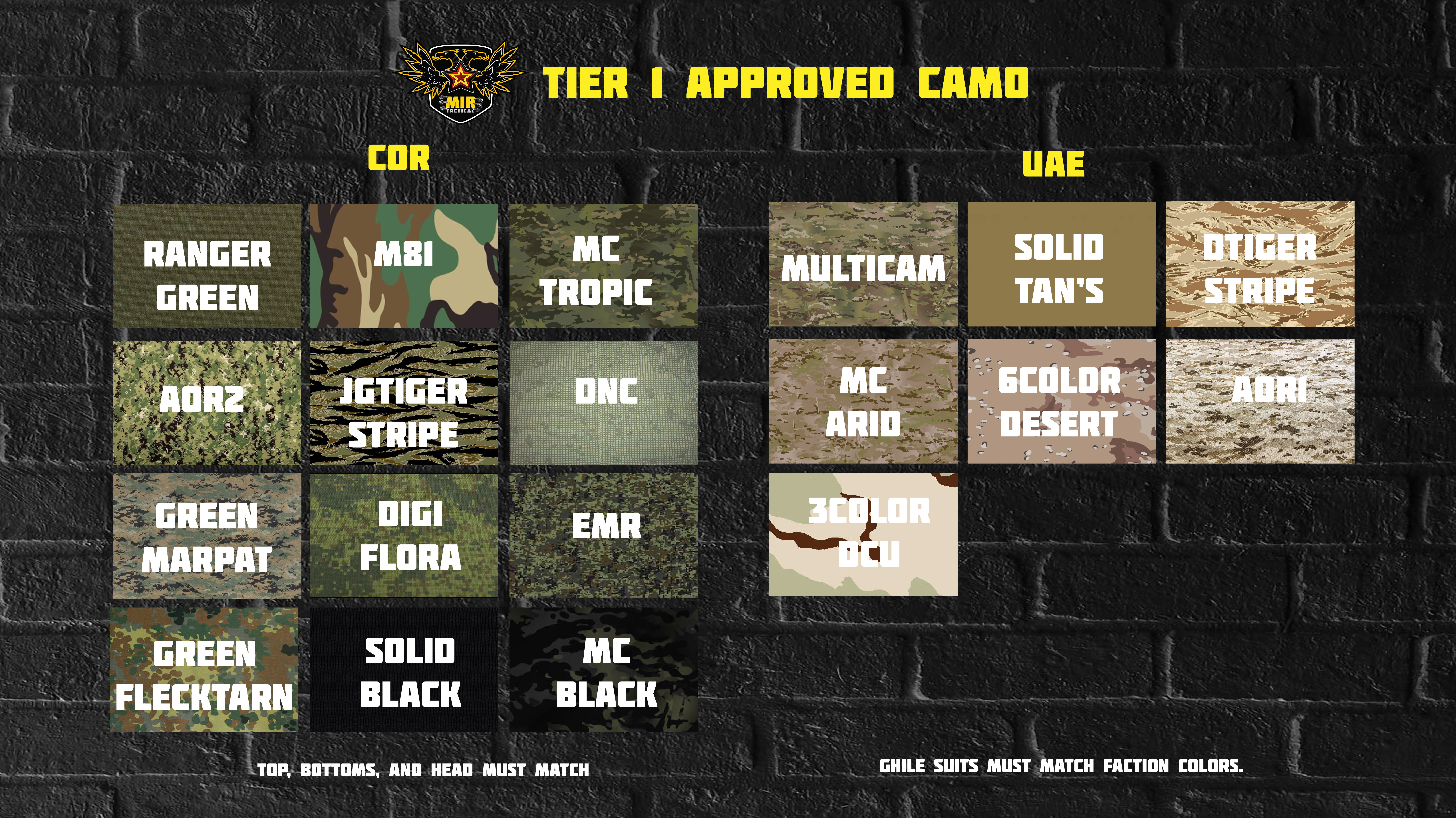 *This list is the ONLY Approved camo patterns allowed at Mir Tier 1. If you do have a camo you’d like to see added in the future please feel free to reach out, and we will take it into consideration for future.